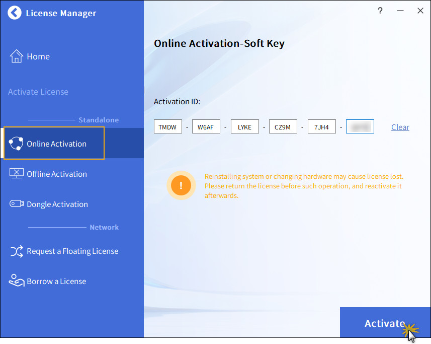 Máte-li přístup na internet, můžete aktivační ID přímo odeslat na autorizovaný server ZWCADu a získat samostatnou licenci. Toto je nejrychlejší způsob aktivace.