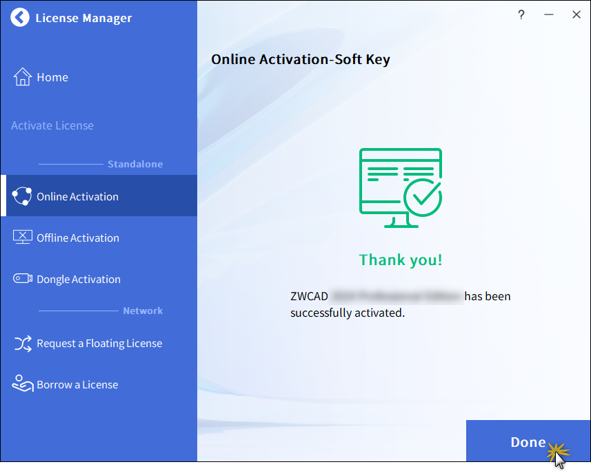 Klikněte na Hotovo pro návrat na stránku Správce licencí ZWCAD.