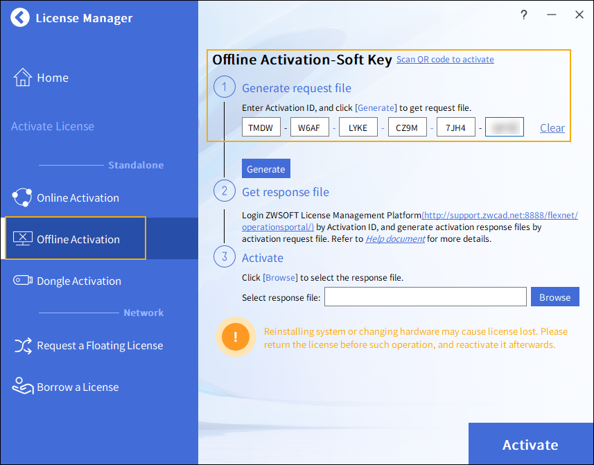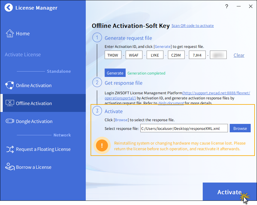Pokud není k dispozici internet, můžete vygenerovat soubor s žádostí o aktivaci aktivací pomocí aktivačního ID, odeslat soubor s žádostí do registračního centra ZWSoft nebo se přihlásit na platformu samoobslužné aktivace ZWCAD, abyste získali aktivační soubor, a poté aktivujte svůj ZWCAD pomocí souboru odpovědí.