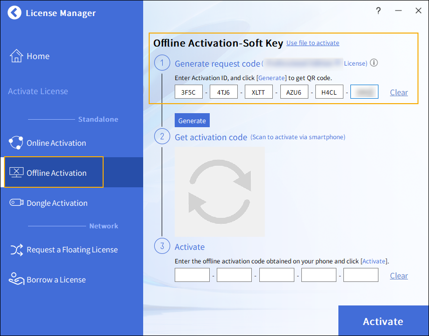 - Naskenujte QR kód pro aktivaci na stránce Offline aktivace – softwarový klíč.