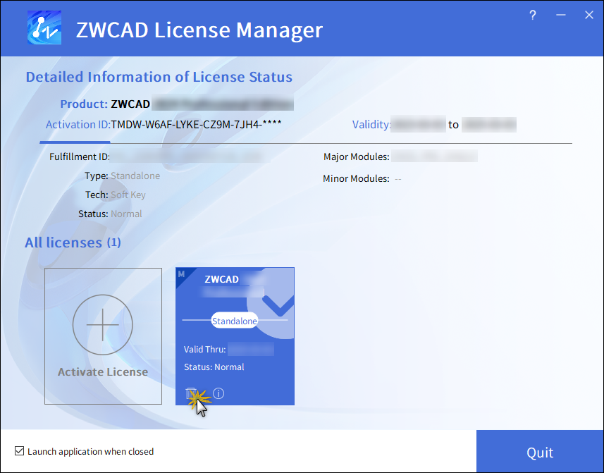 Klikněte na Aktivovat licenci, čímž vstoupíte na stránku Aktivovat licenci ZWCAD.