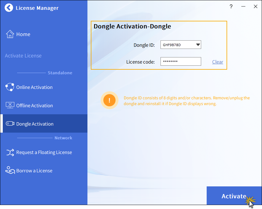Máte-li USB klíč ak němu Aktivační ID a Licenční kód pro Vaši licenci ZWCADu - můžete si ZWCAD aktivovat následujícím způsobem.