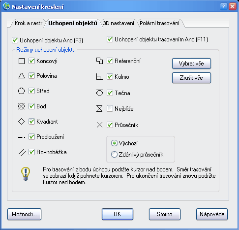 vyberieme všetky režimy uchopenia objektov pre kreslenie okrem režimu