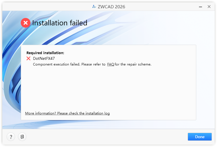 Pokud průvodce instalací zobrazí výzvu Instalace selhala (Installation Failed), klepněte na tlačítko Hotovo (Done) pro ukončení procesu a počkejte, dokud se problém nevyřeší, abyste mohli znovu nainstalovat