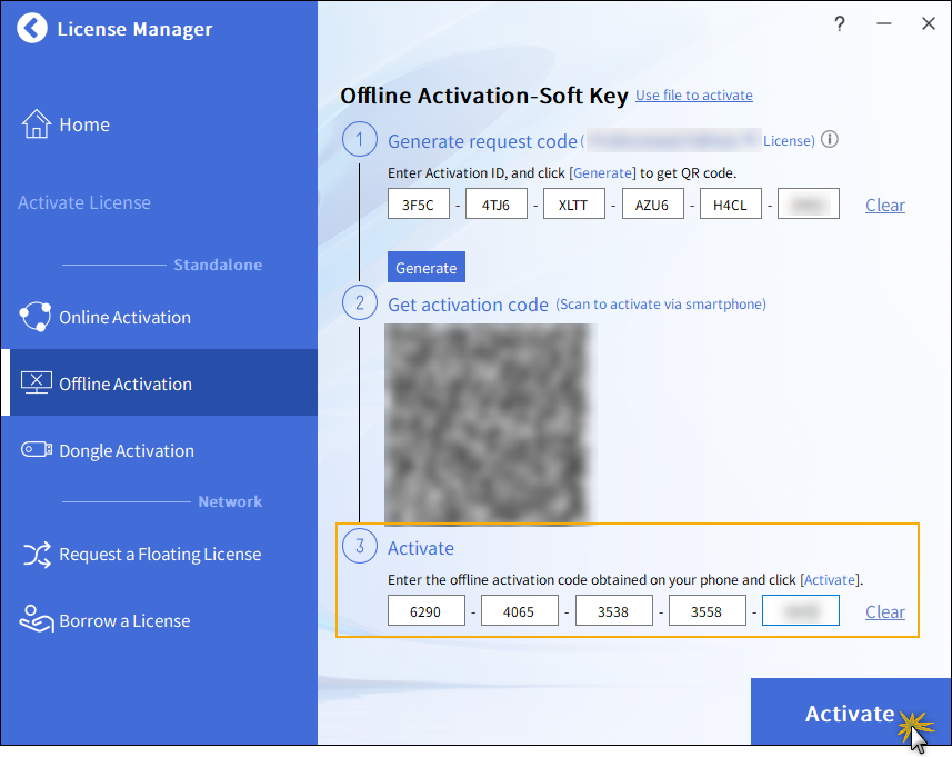 - Naskenujte QR kód pro aktivaci na stránce Offline aktivace – softwarový klíč.