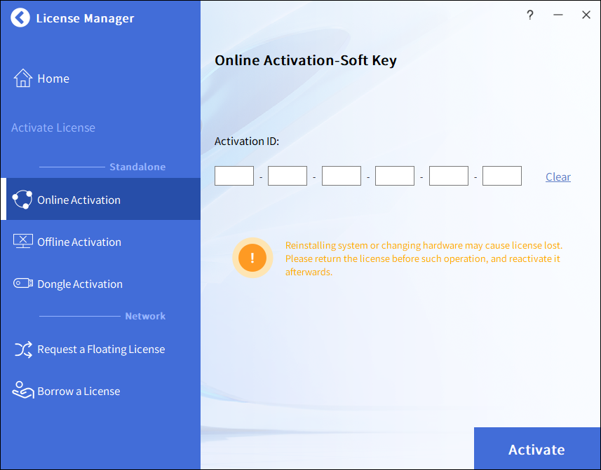 Klikněte na Online aktivace v seznamu Aktivovat licenci, čímž se zobrazí stránka Online aktivace - softwarový klíč. Zadejte své Aktivační ID a klikněte na Aktivovat, čímž aktivujete produkt.