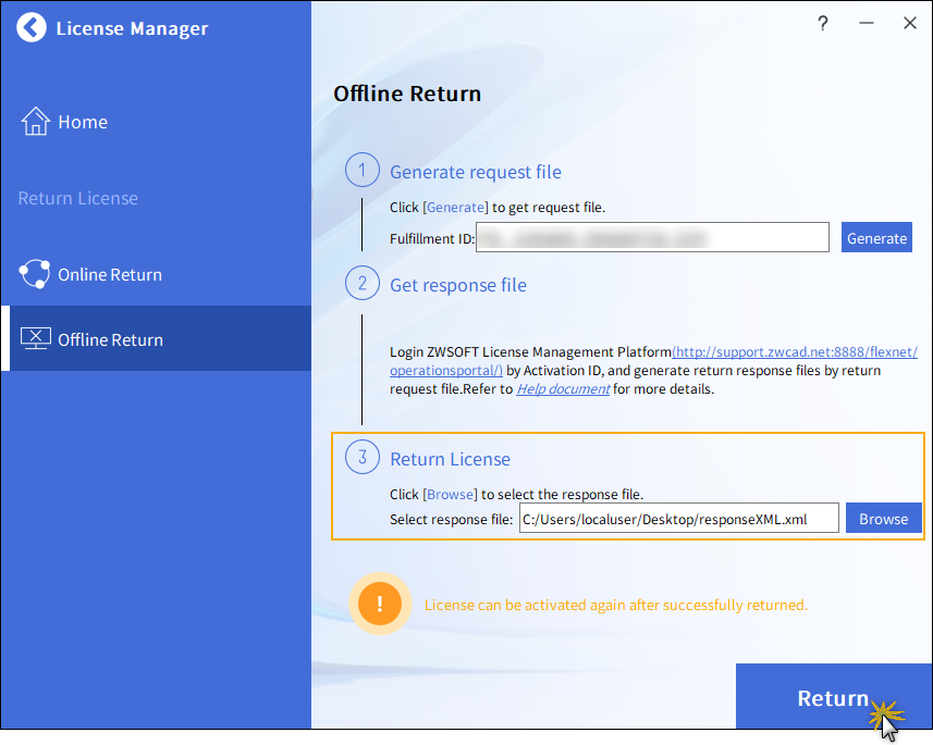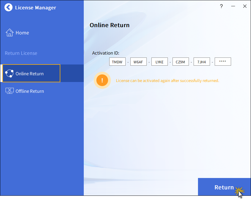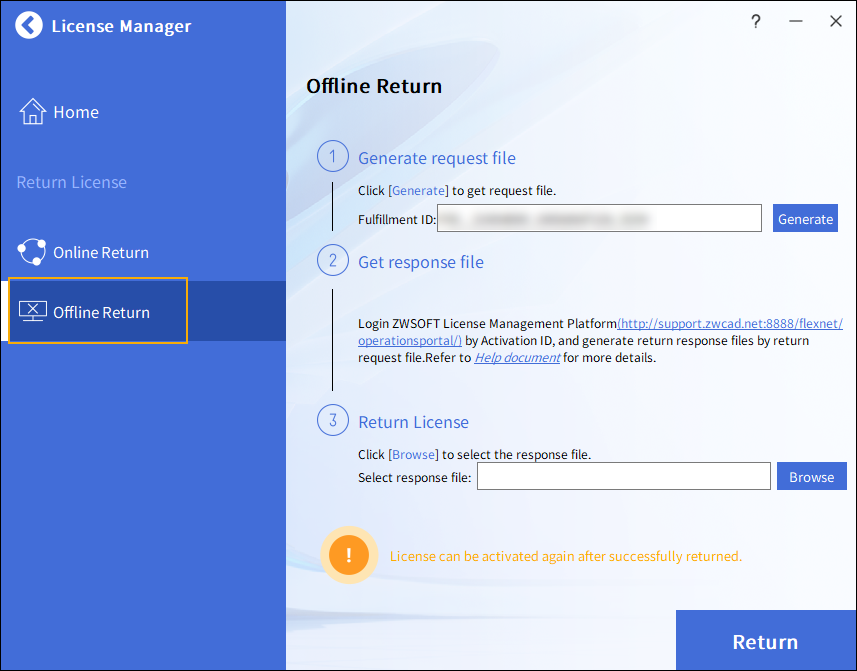 Tato funkce se používá pro přenos licencí a aktualizaci produktu. Pokud chtějí uživatelé přenést licenci z původního počítače na jiný nebo aktualizovat svůj produkt ZWCAD za podmínky, že některé licence byly aktivovány, musí nejprve vrátit licenci z původního počítače před opětovným získáním autorizace.