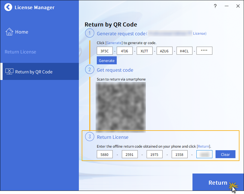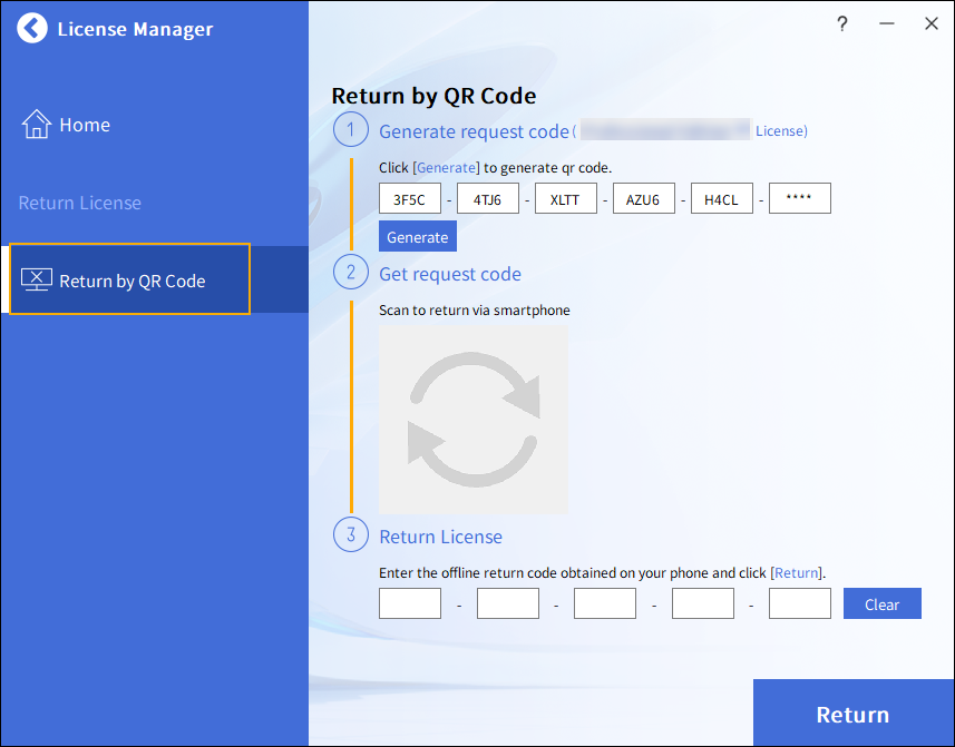 Chcete-li vrátit licenci aktivovanou pomocí QR kódu, klikněte na
