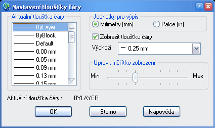 Štandardná hrúbka čiary ByLayer v počiatočnom nastavení pre všetky objekty je